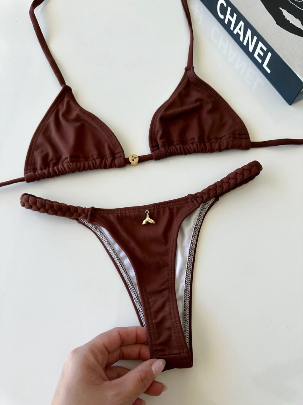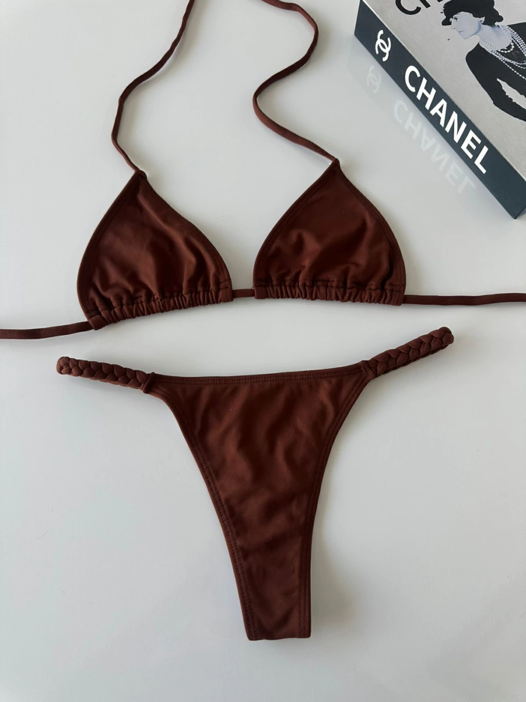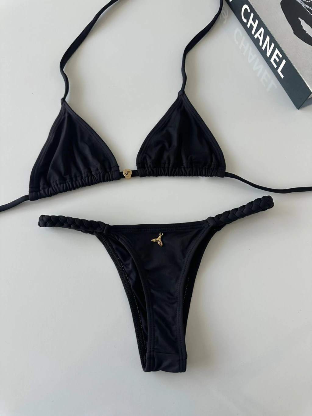 Um conjunto que une o charme do top cortininha com a sensualidade da calcinha fio dental.