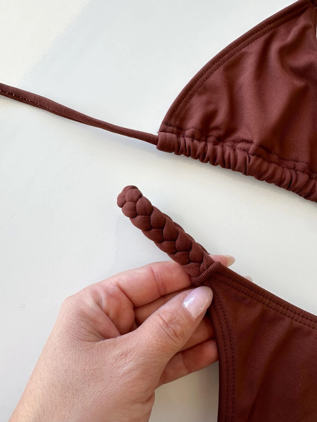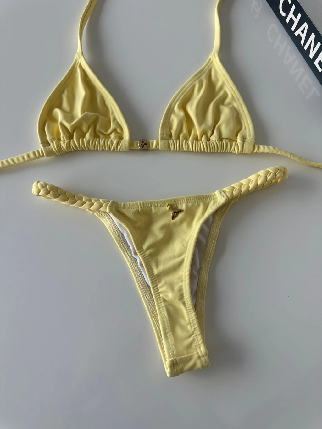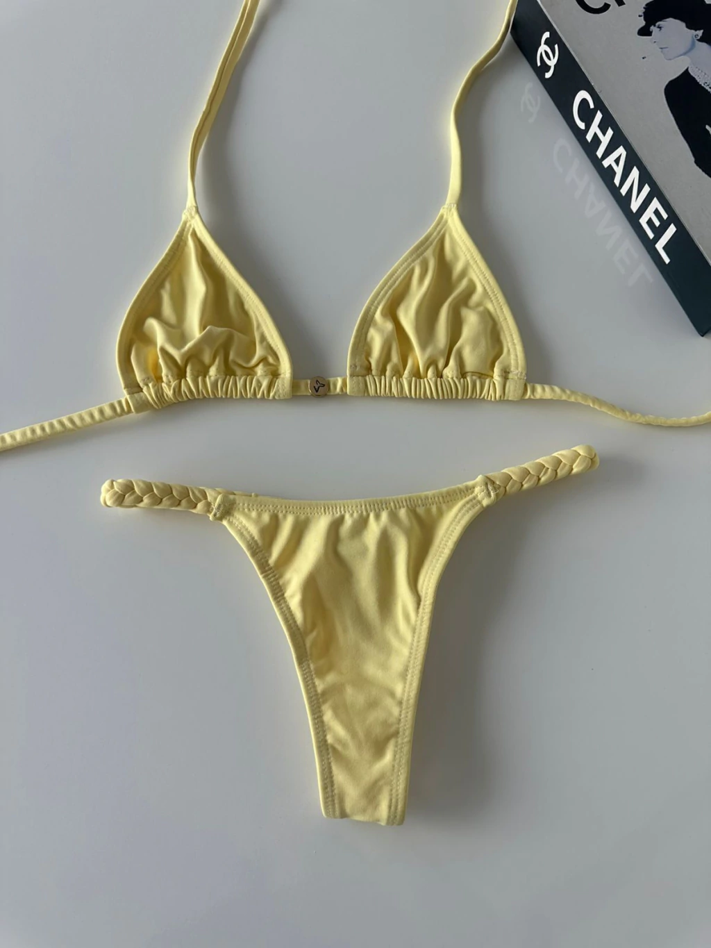 Um conjunto que une o charme do top cortininha com a sensualidade da calcinha fio dental.