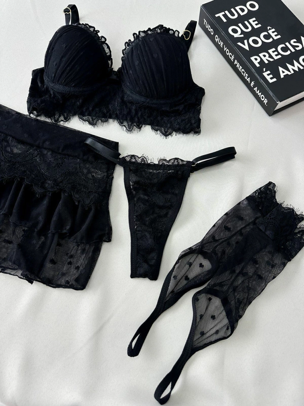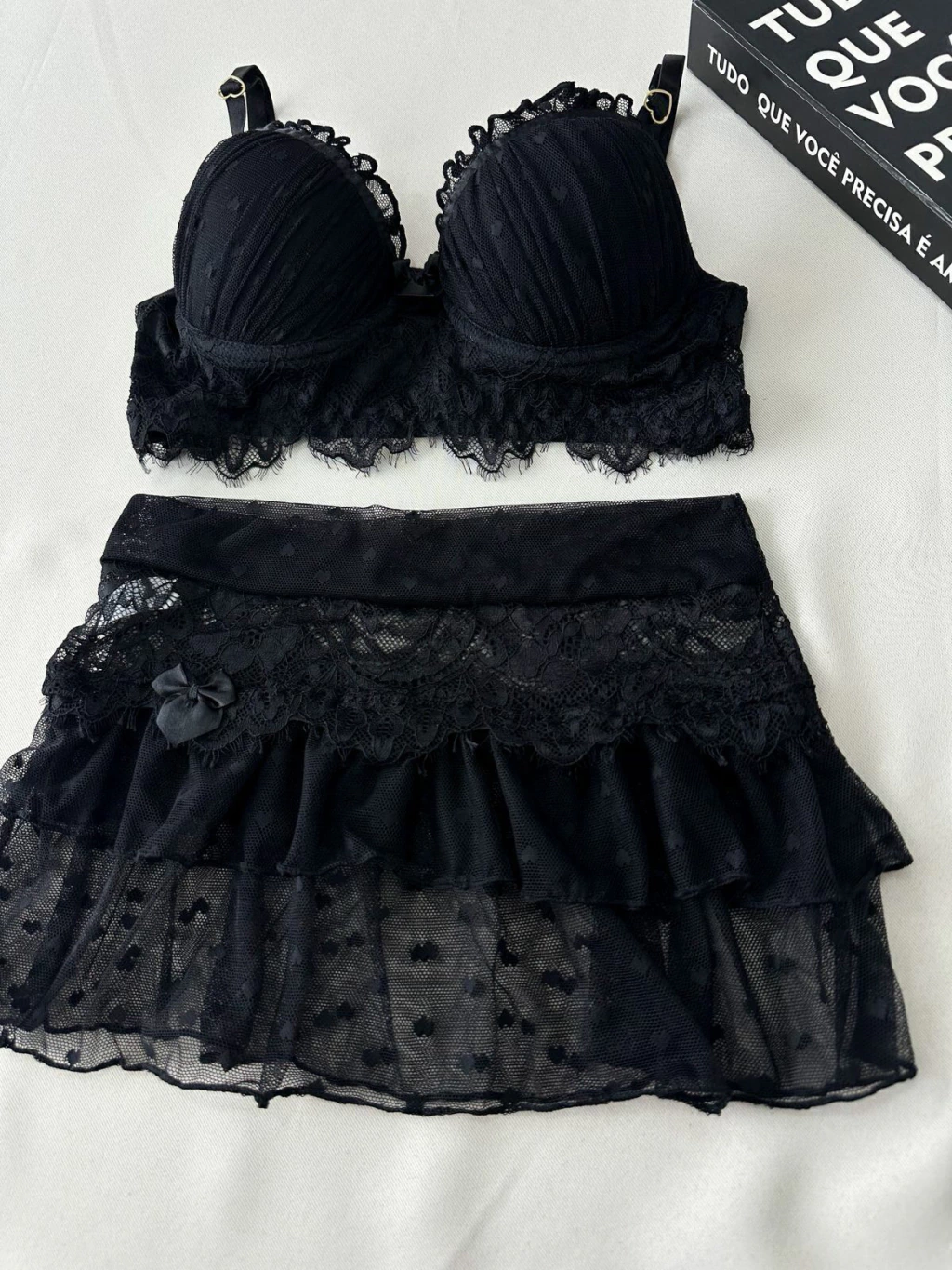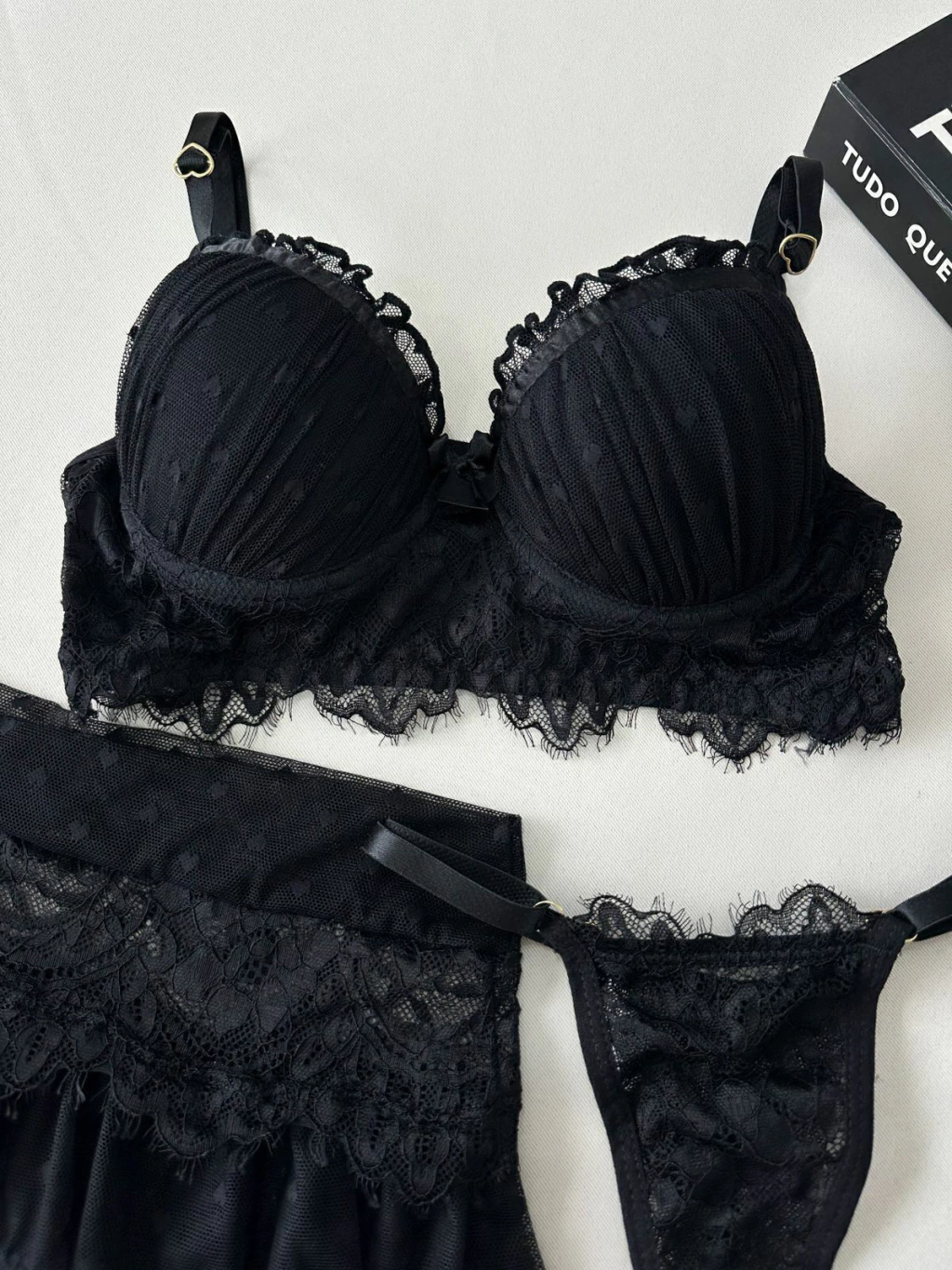 Sutiã possui bojo e calcinha com reguladores de coração na lateral.