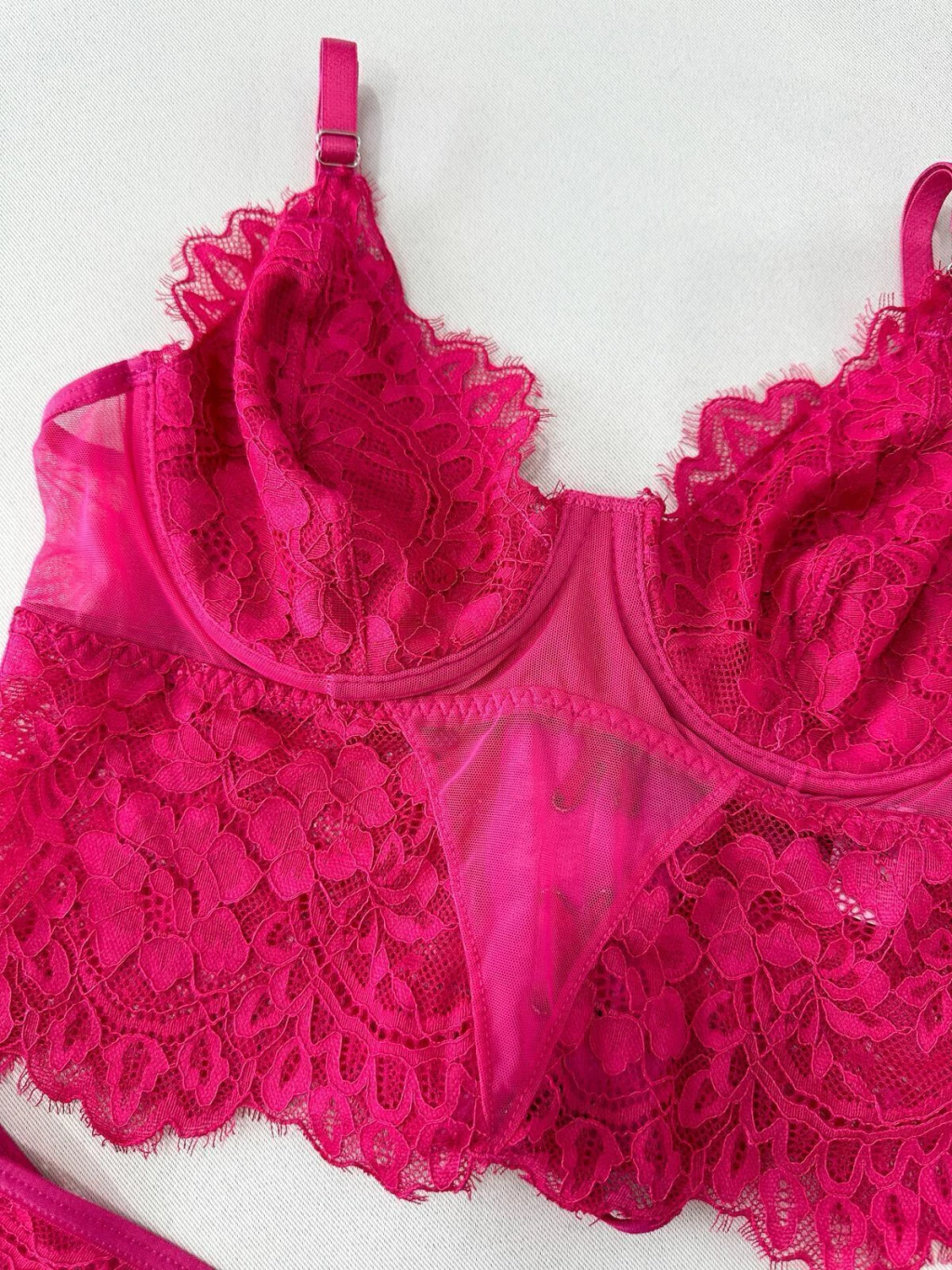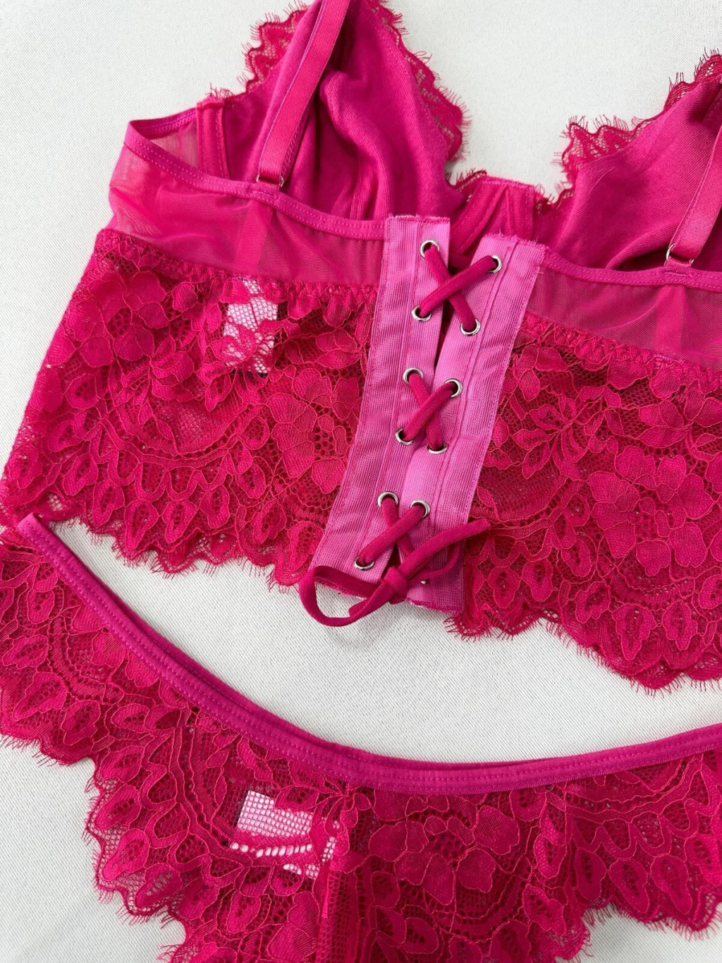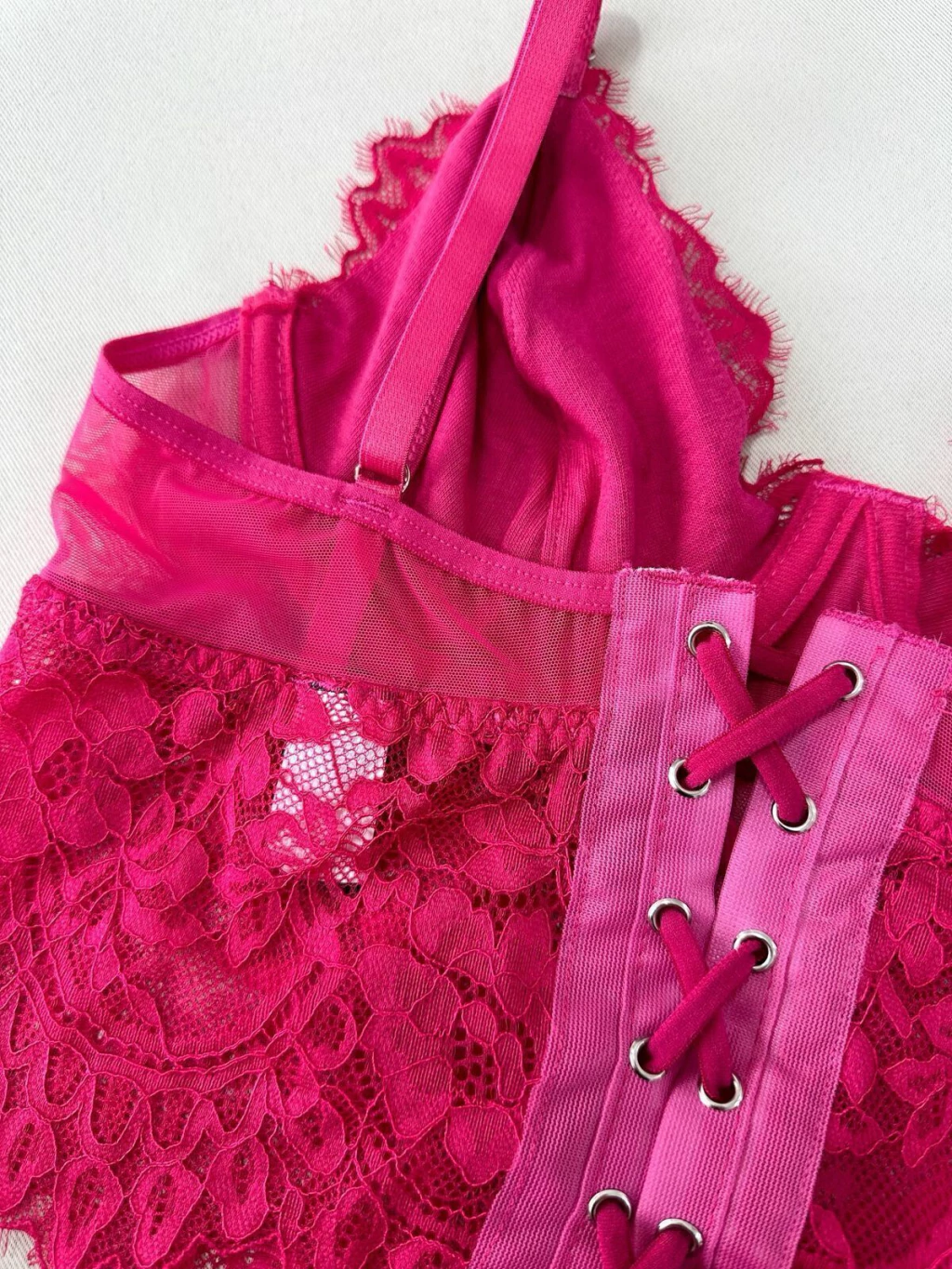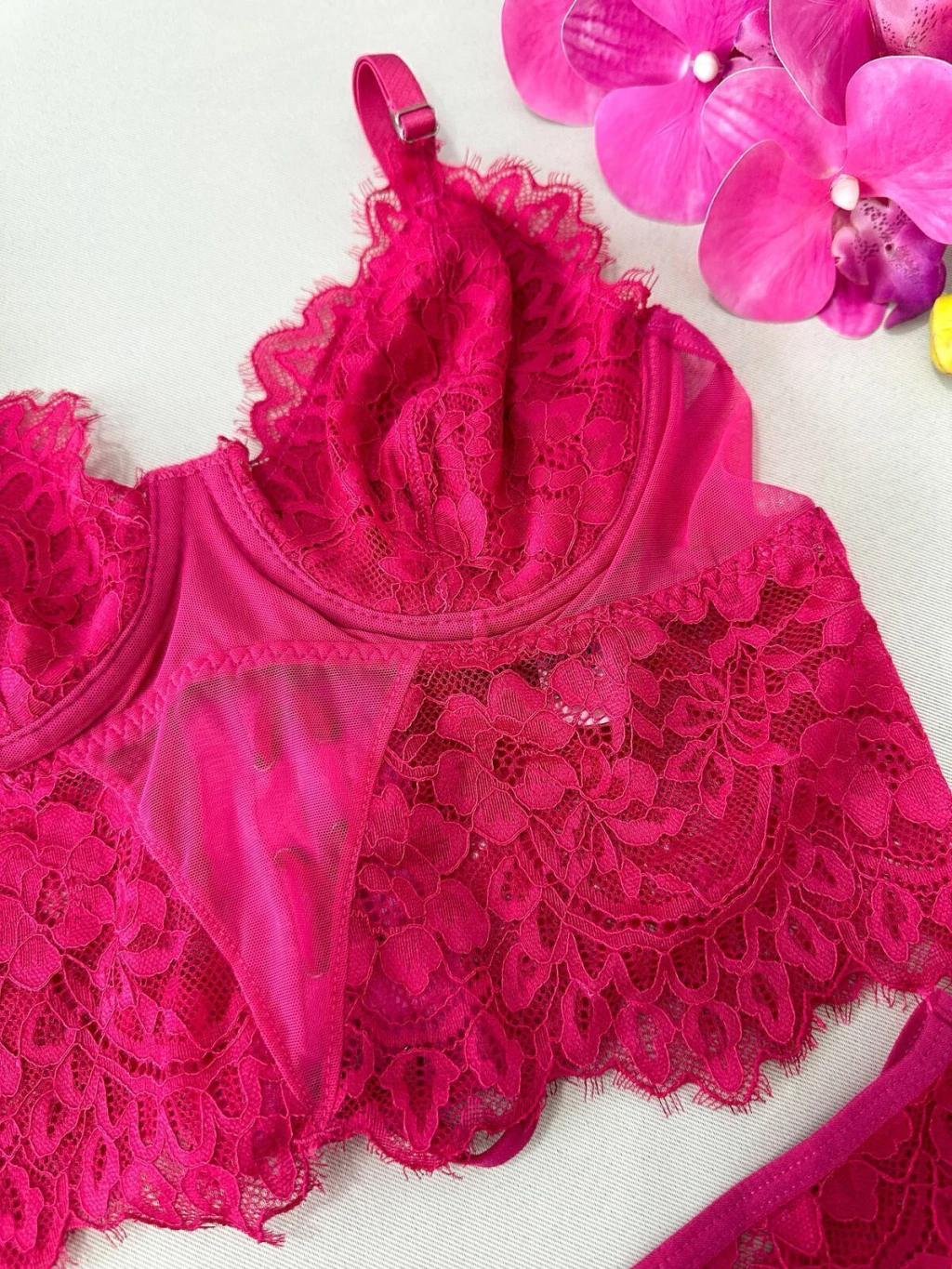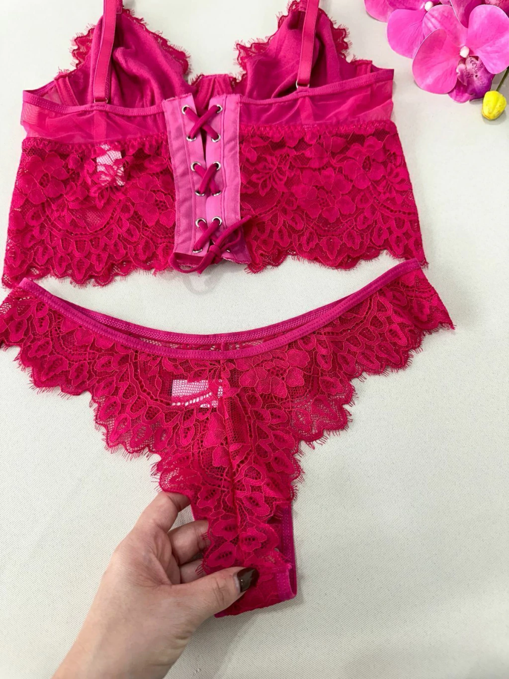 O sutiã combina a leveza do tule com a elegância da renda, trazendo um charme especial com o fecho em ilhós nas costas — um detalhe marcante que valoriza as curvas e adiciona um toque ousado ao visual. A calcinha em renda complementa o conjunto com feminilidade e conforto, ideal para momentos especiais ou para se sentir incrível todos os dias.